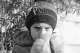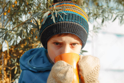 The boy drinks from a mug of warm tea on the background of sea buckthorn. Autumn.