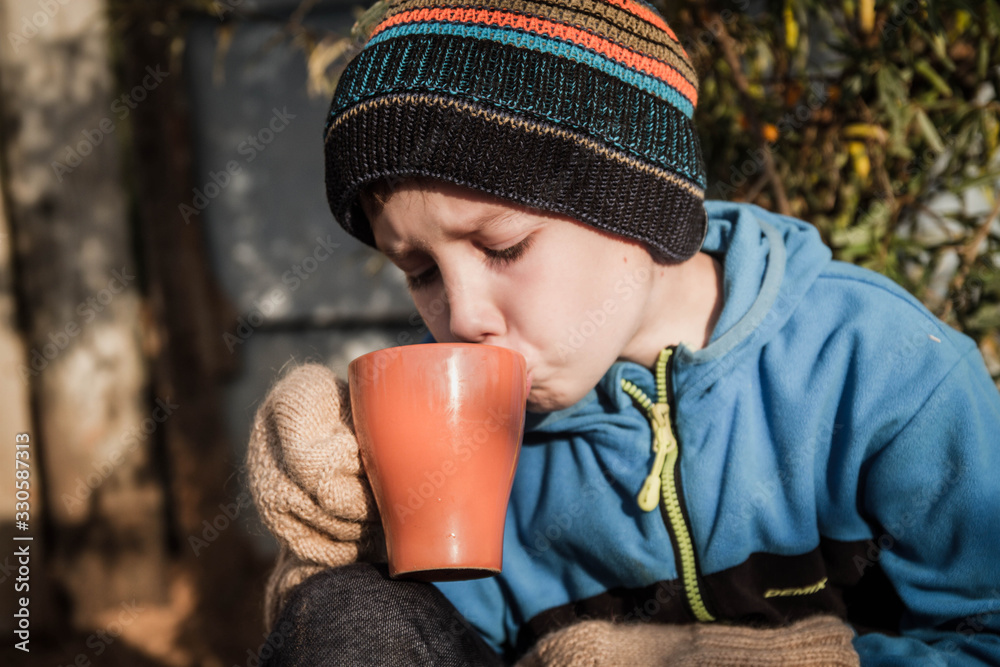 The boy is cold and drink from a Cup to keep warm.