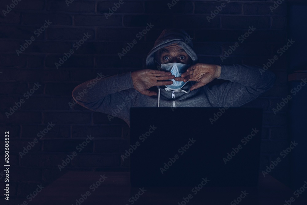 Man working at home during quarantine. Frightened man in medical mask reading informations about coronavirus