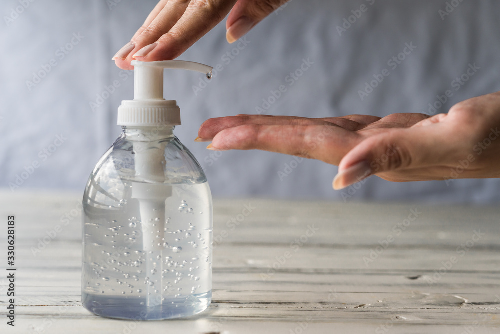 Young woman using hand sanitizer gel with liquid alcohol disinfectant for prevention of coronavirus and other pandemic and epidemic diseases
