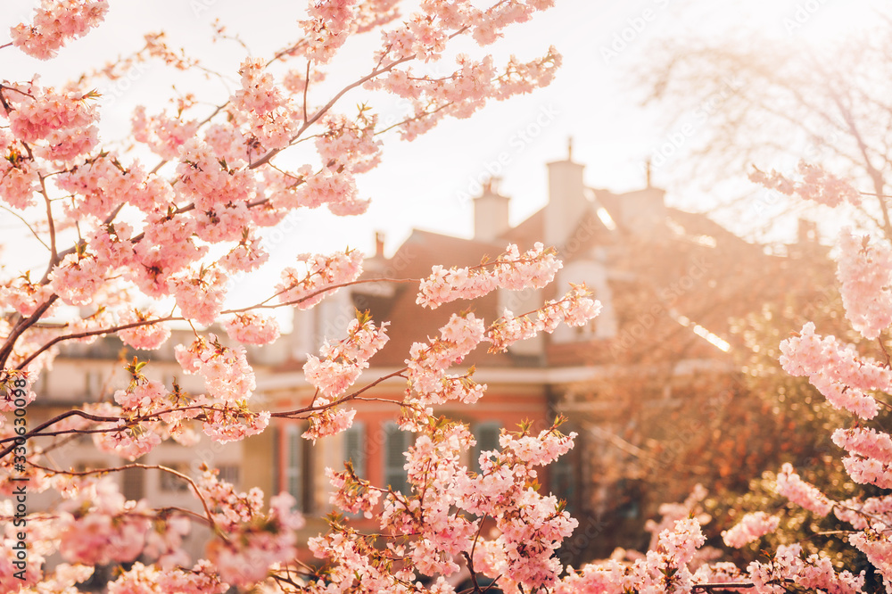 Romantic image of old french facade taken through spring blossoming cherry flowers