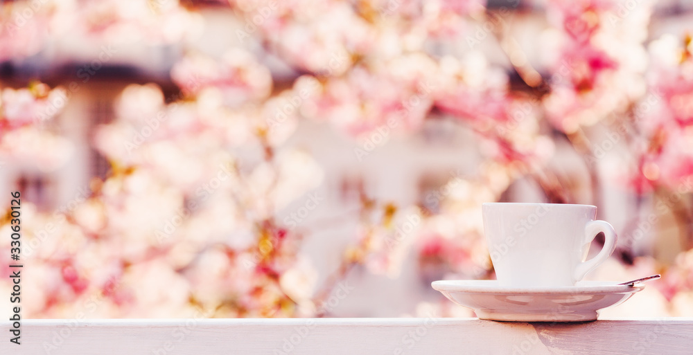 Cup of coffee on the balcony with beautiful view of blooming spring flowers