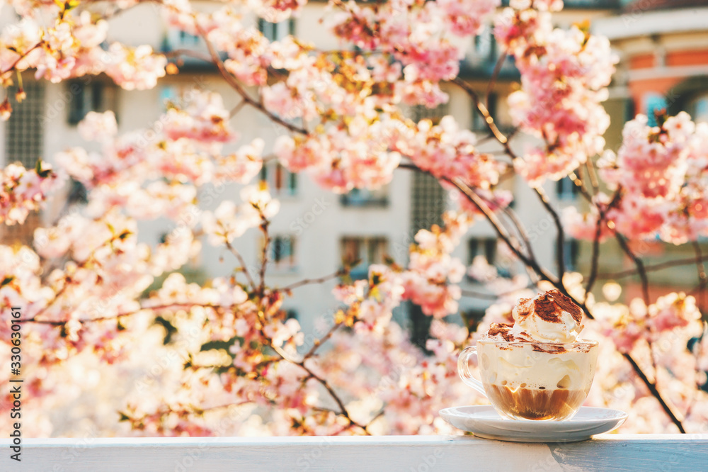 Cup of cappuccino on the balcony with beautiful view of blooming spring flowers