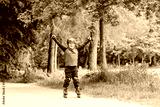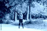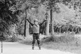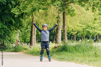 Active little boy skating in summer park, healthy lifestyle for children, holding arms up wide open