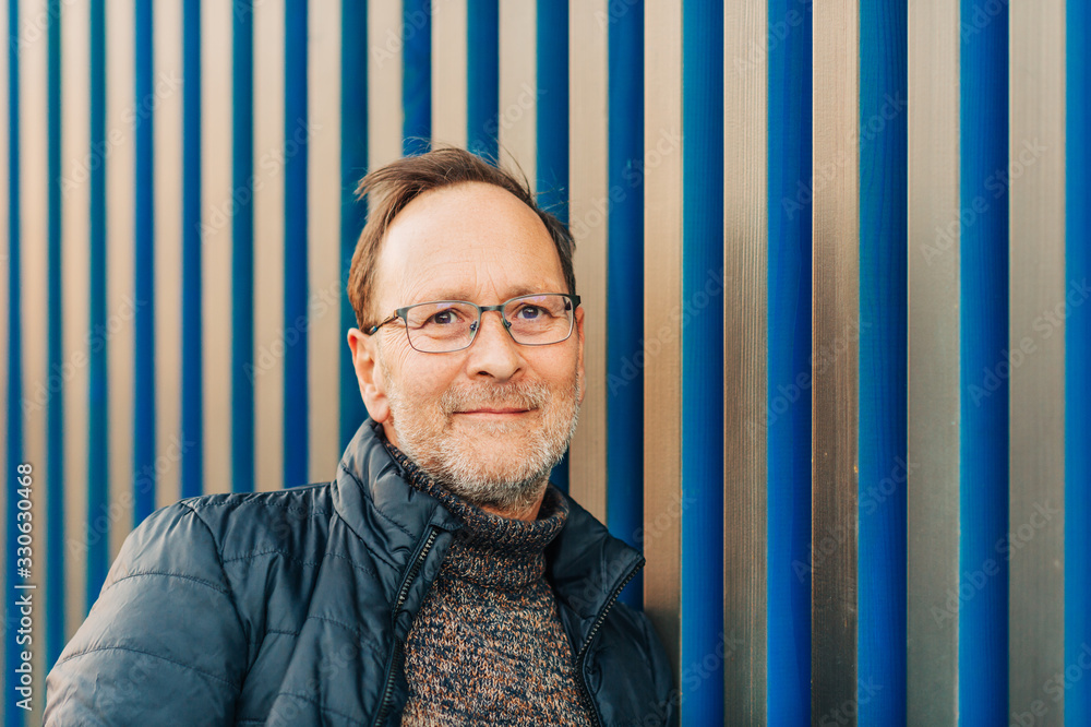 Outdoor portrait of middle age man wearing eyeglasses, leaning on blue wall
