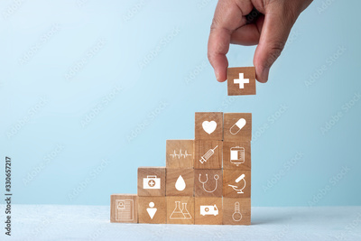 Insurance for your health and healthcare concept, Businessman hand arranging wood block stacking with icon healthcare medical.