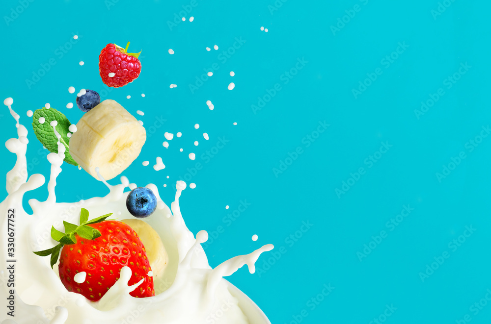 Cream splash with falling fruits and berries on aqua blue background. Copy space