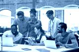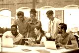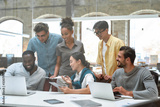We are the best team ever. Group of young and cheerful business people in casual wear discussing project results and smiling while sitting in the creative office