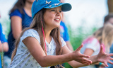 Szczęśliwe dziecko bawi się i gra w piłkę z dziećmi na koloniach podczas wakscji letnich