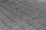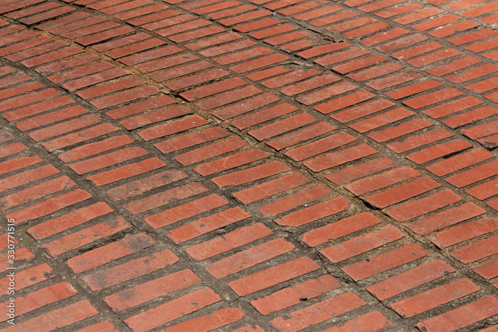 Brick background, floor with wide mortar set in sweeps, red clay brick pattern texture, horizontal aspect