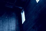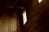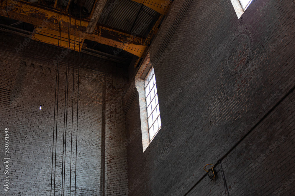 High window illuminating a brick interior of an industrial site, horizontal aspect