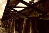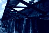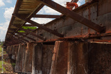 Rusting low train trestle with outrigger walkway outside a derelict manufacturing facility, horizontal aspect