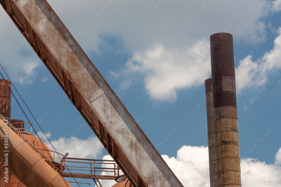 Sloss Furnaces National Historic Landmark, Birmingham Alabama USA, smoke stacks pipes and chute, rusting steel construction, horizontal aspect