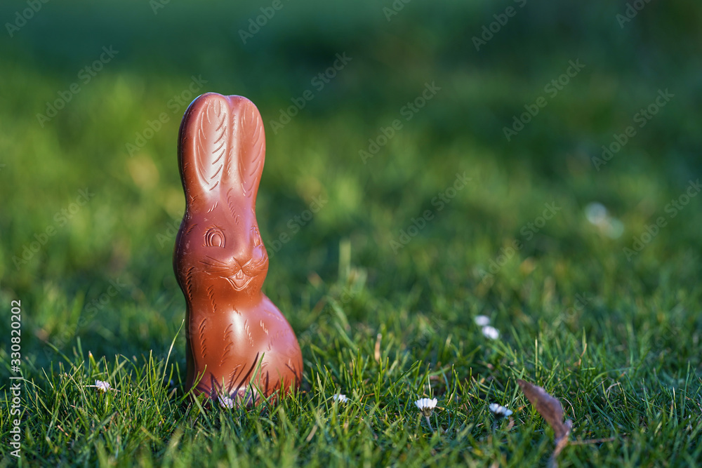 easter, sweets and confectionery concept - chocolate bunny on grass with blurred background, easter bunny