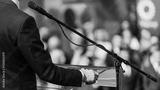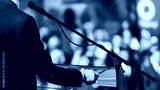 Election campaign, politician on stage, speaking to the crowd
