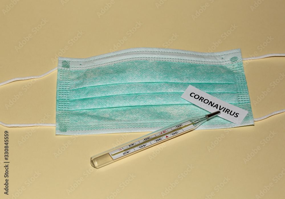 Plain surgical protective mask with text CORONAVIRUS and medical thermometer on it close up, pastel color background