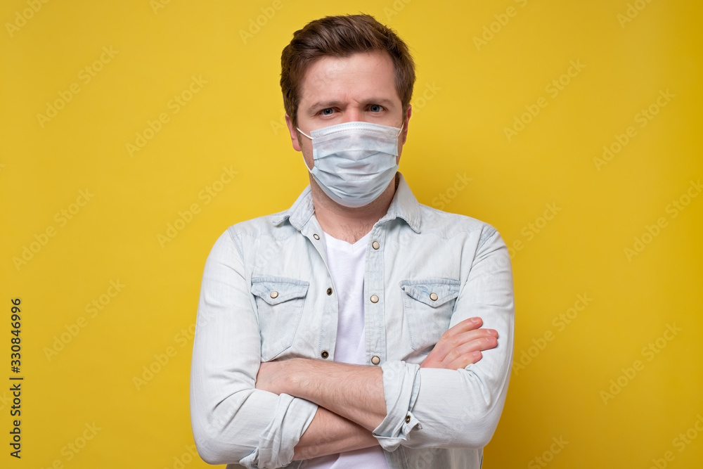 Caucasian young doctor wearing medical mask trying to protect from flu or coronavirus.