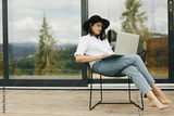 Stylish hipster girl sitting with laptop on terrace at big window. Young happy woman in hat using laptop, shopping or working online from home outdoors. Freelance and freelancer
