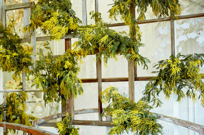 Floral decor. Screen made of wooden frames decorated with Mimosa.