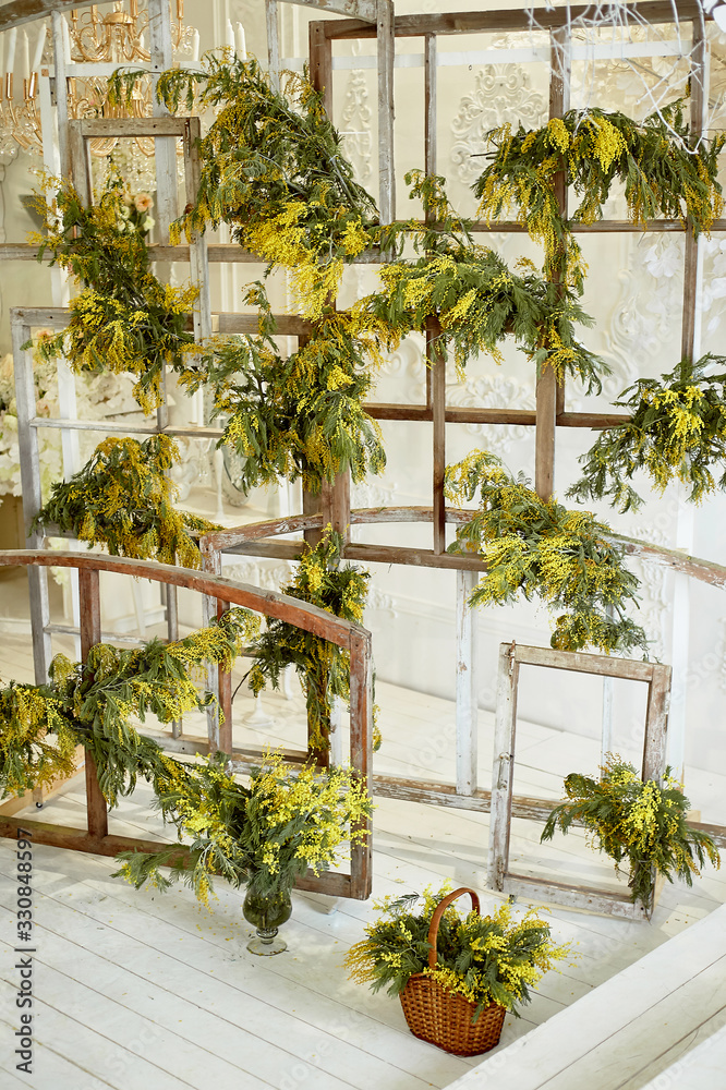 Floral decor. Screen made of wooden frames decorated with Mimosa.