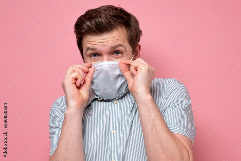 Man in protective hygienic mask afraiding of coronavirus epidemic, infection