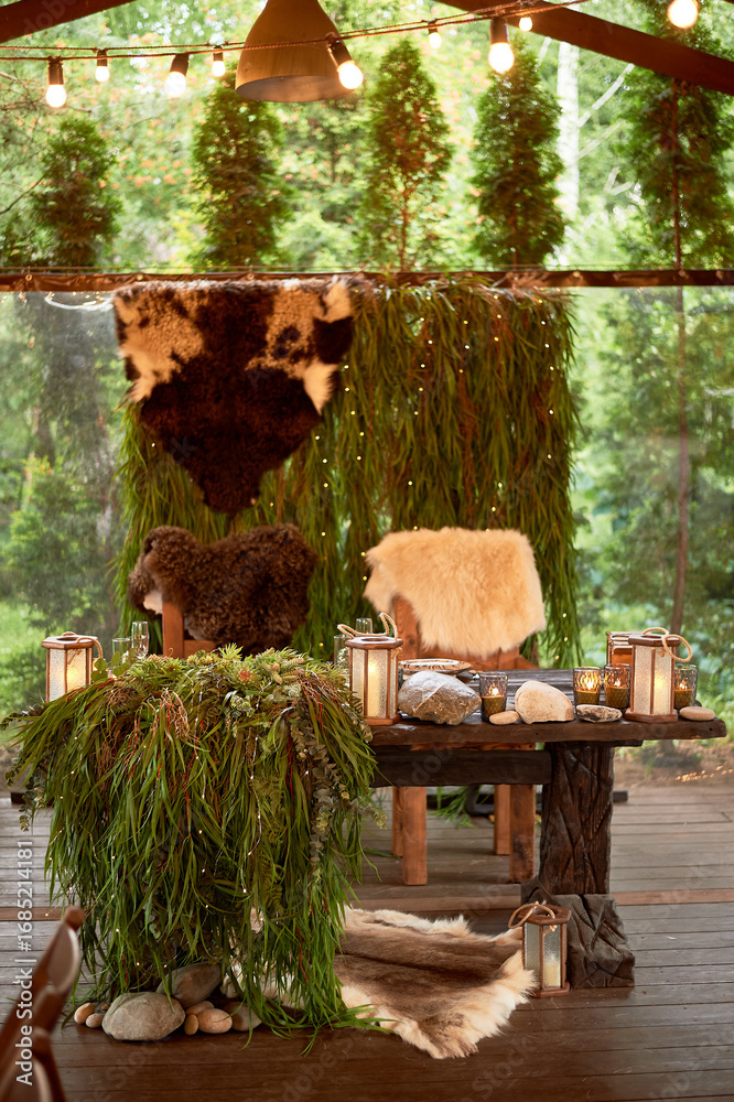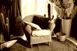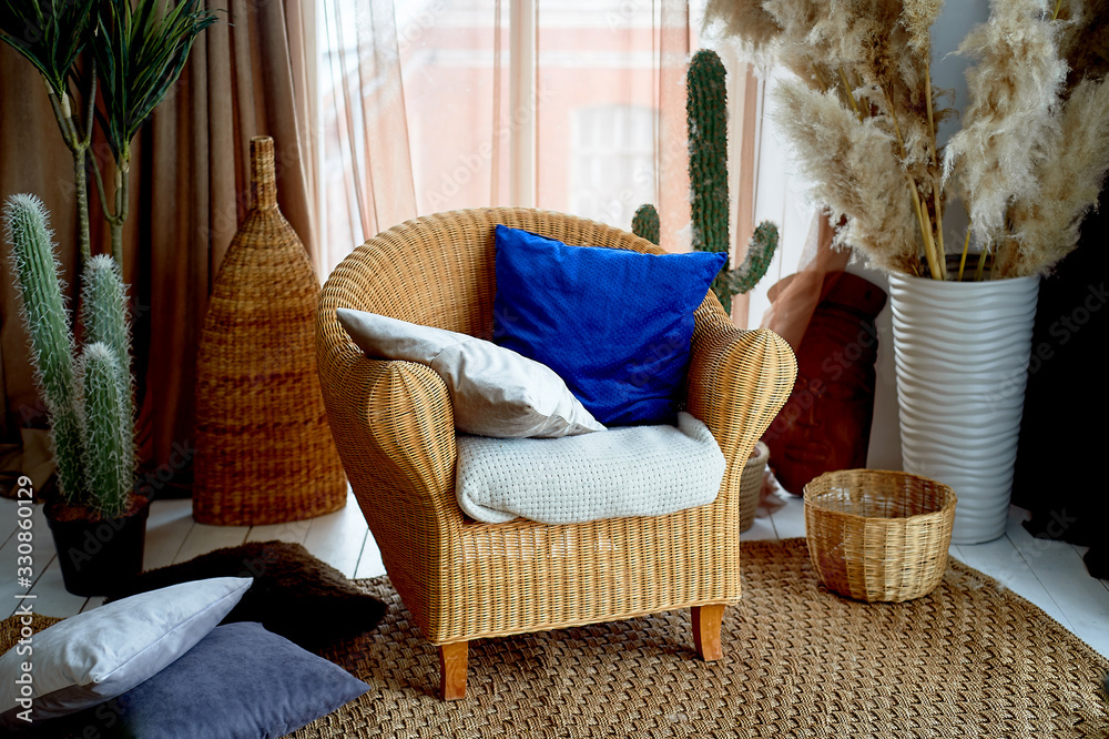 A chair and a rug made of rattan. Natural material. Pampas grass in a vase. Eco design.
