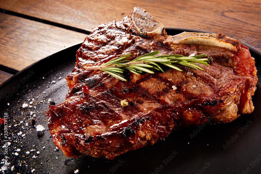 Grilled beef steak with rosemary, salt and pepper on black stone plate. Grilled striploin sliced steak. Juicy thick grilled beef steak seasoned with rosemary fresh of the summer BBQ.