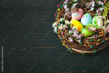 Happy Easter. Congratulatory easter background. Easter eggs and flowers. Background with copy space. Selective focus. Top view.