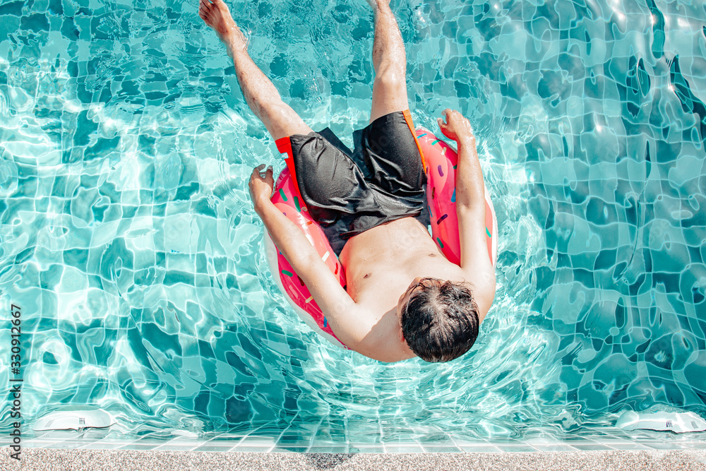 Holiday and vacation concept The man on the swim ring in the pool during the day Happy and relaxed.
