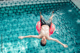 Holiday and vacation concept The man on the swim ring in the pool during the day Happy and relaxed.