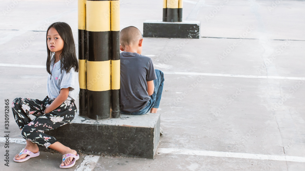 Asian girls and boys waiting for their parents at the mall parking lot.