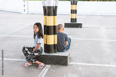 Asian girls and boys waiting for their parents at the mall parking lot.