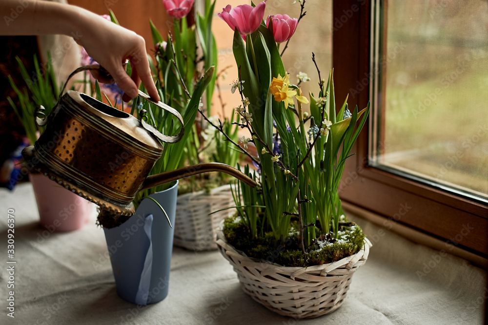 Primroses grown at home. On a beautiful windowsill near the window. Hand with watering can, care for flowers. Hobby. Tulips and Muscari, .