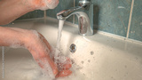 CLOSE UP: Unrecognizable woman rinses her soapy hands after a trip to bathroom.