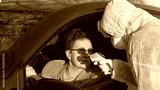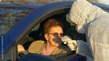 CLOSE UP: Person in protective clothes takes the female driver's temperature.