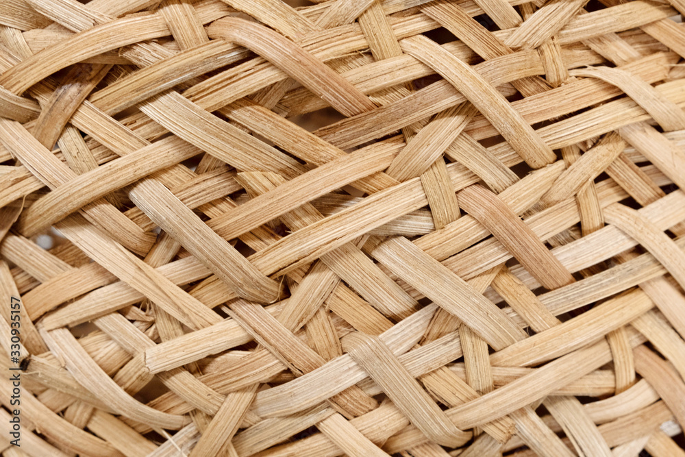 Closeup texture of wicker basket in beige color. Natural materials in the industry. No waste. Recycling. Background and texture.