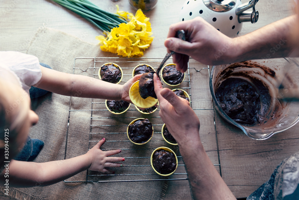 Little girl and man prepare chocolate muffins and bake sweet cakes. Homemade dessert on the table in the kitchen. Hand with spoon and close up. Delicious food and easter time.