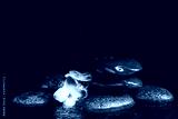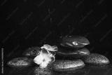 Stones and flowers in water on black background, space for text. Zen lifestyle