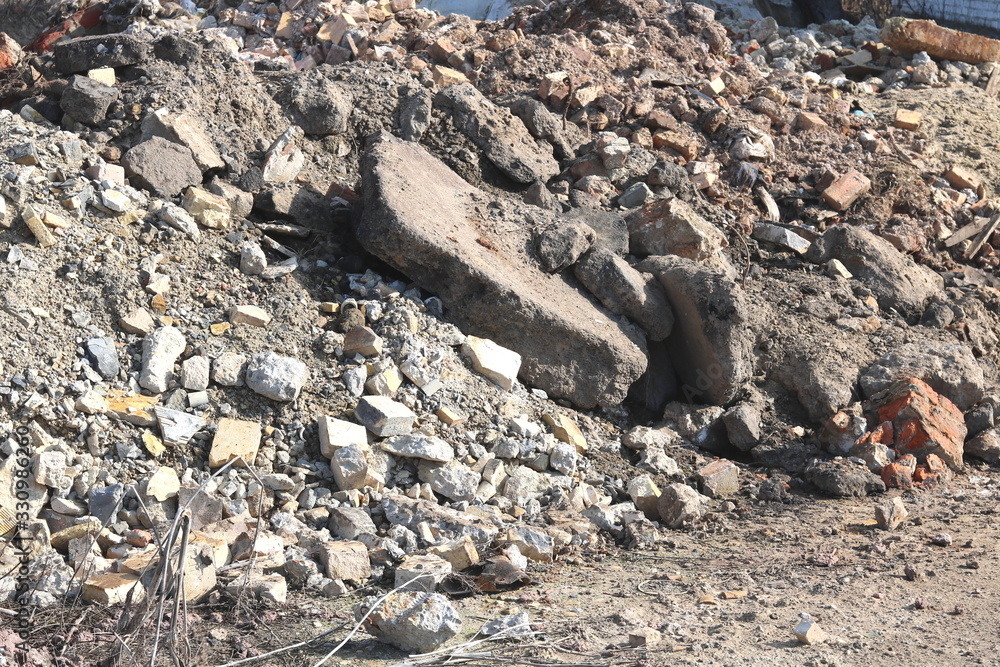 Construction waste with elements of and destroyed old structures at municipal landfill