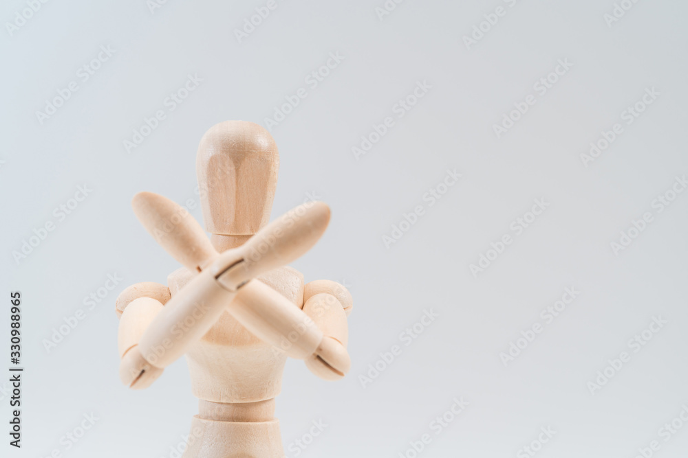 Refusal gesture, Wooden dummy, crossed hands on white background, copy space for your object or text
