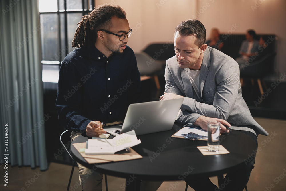 Two businessmen discussing work together at an office table