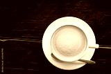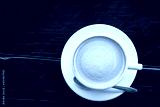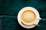 coffee with beautiful smooth froth in a classic white coffee cup top view on dark blue-green wooden table background