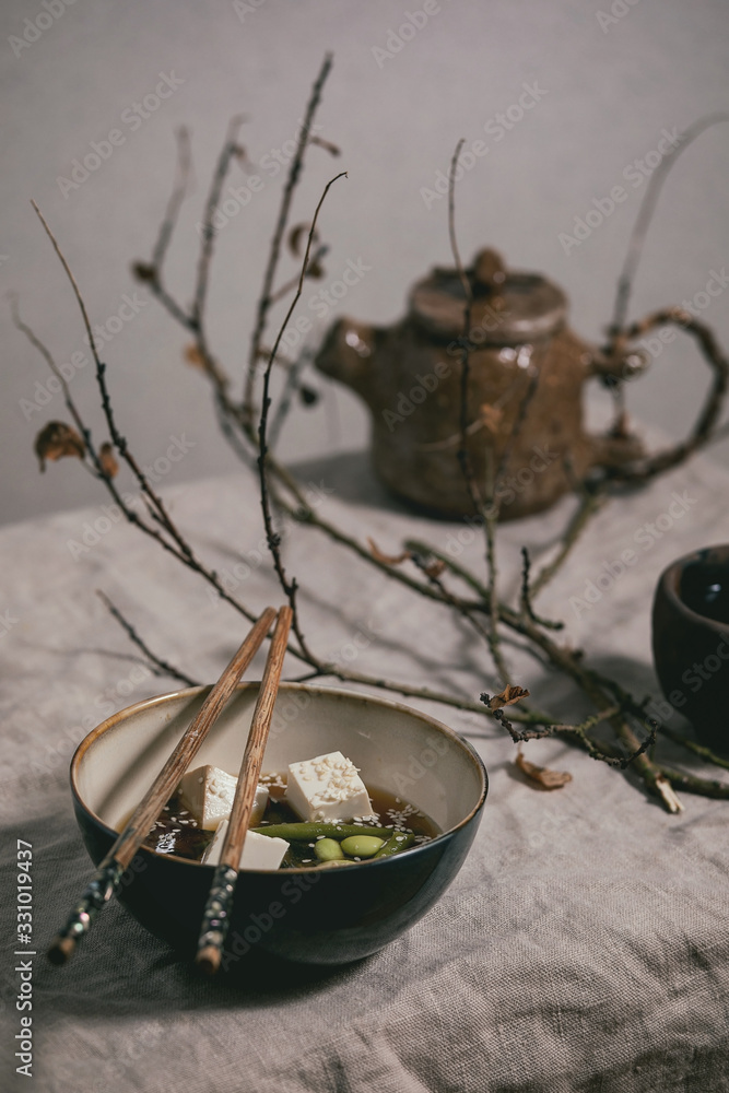 Japanese Miso broth soup with silk tofu cubes, soy beans edamame, green beans in ceramic bowl with chopsticks, clay teatop and cups on grey linen table cloth with autumn branches. Asian dinner.