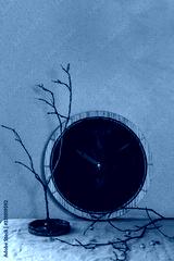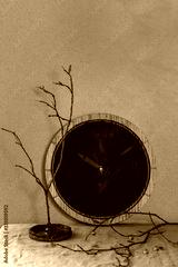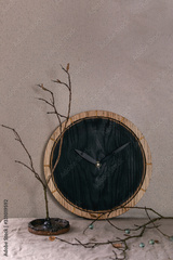 Wall black burned round wooden clocks on table with grey linen tablecloth and dry branches. Interior design