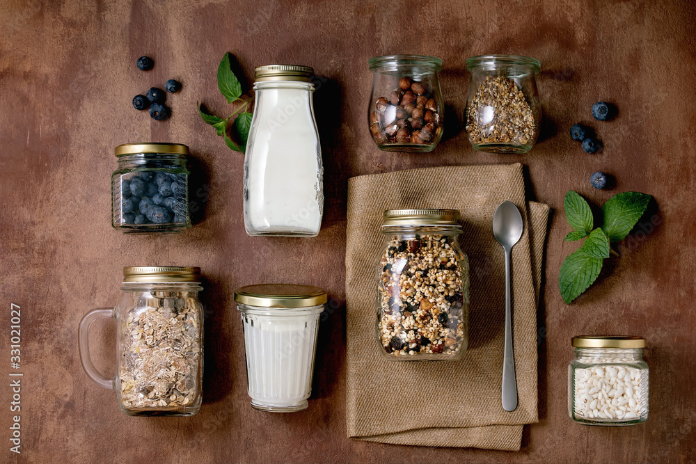 Homemade crunchy puffed millet grain granola with dried fruits and nuts, yogurt, milk, muesli in different glass jars, mint. Brown background. Flat lay, space. Healthy food eco friendly breakfast