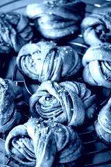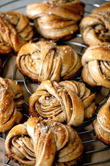 Traditional Swedish cardamom sweet buns Kanelbulle on cooling rack on beige linen table cloth. Close up