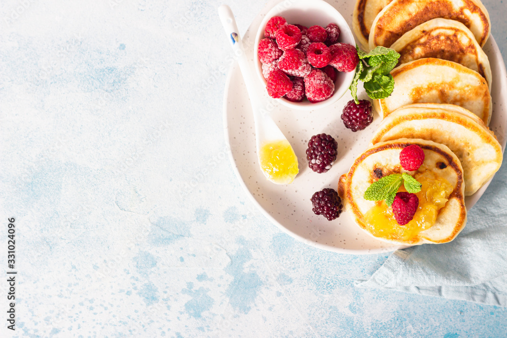 Pancakes with orange jam, frozen berries (raspberries and blackberries) and mint on light blue stone background. Breakfast. Top view.