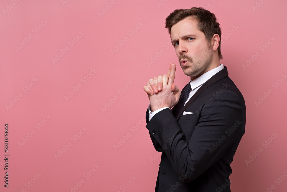 Confident young businessman makes shooting gesture like secret agent, recieves great success