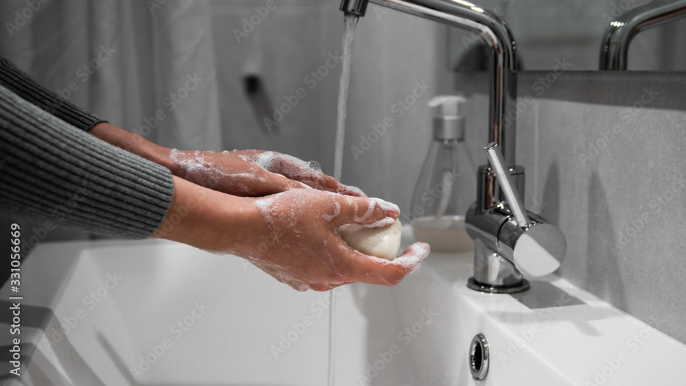 Health care hygiene prevention protection against virus, bacteria, flu and coronavirus, covid-19 disease by washing hands with soap