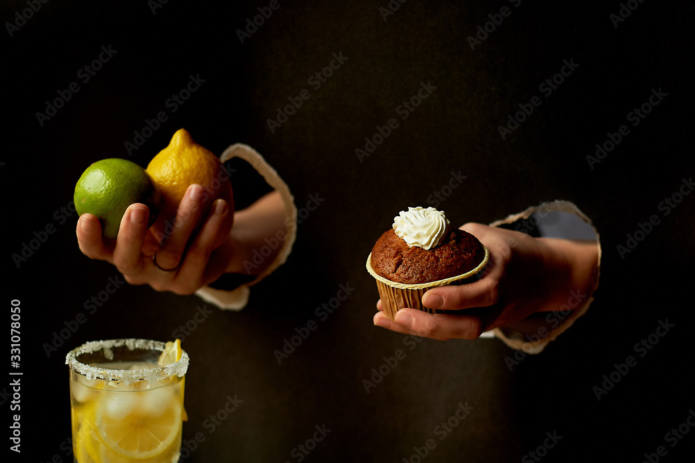 Hand in the paper hole.Dark background. Lemon, lime and lemonade. Refreshment. Collage